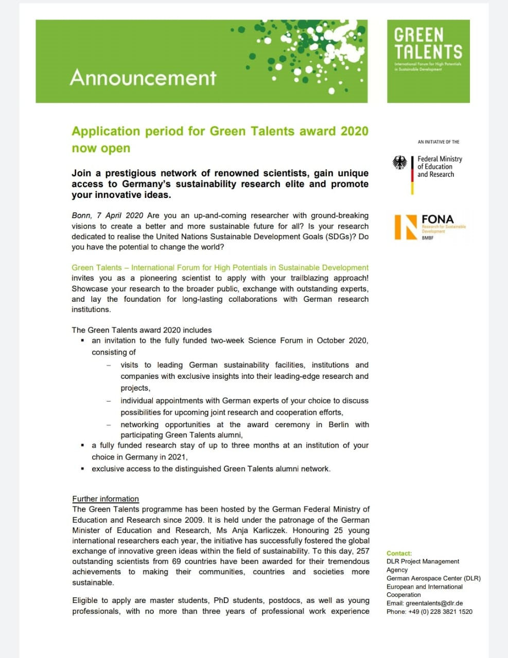 Sin categoría Convocatoria para el premio Green Talents 2020 para investigadores jóvenes por Administrador IIPS|Publicada 20 abril, 2020