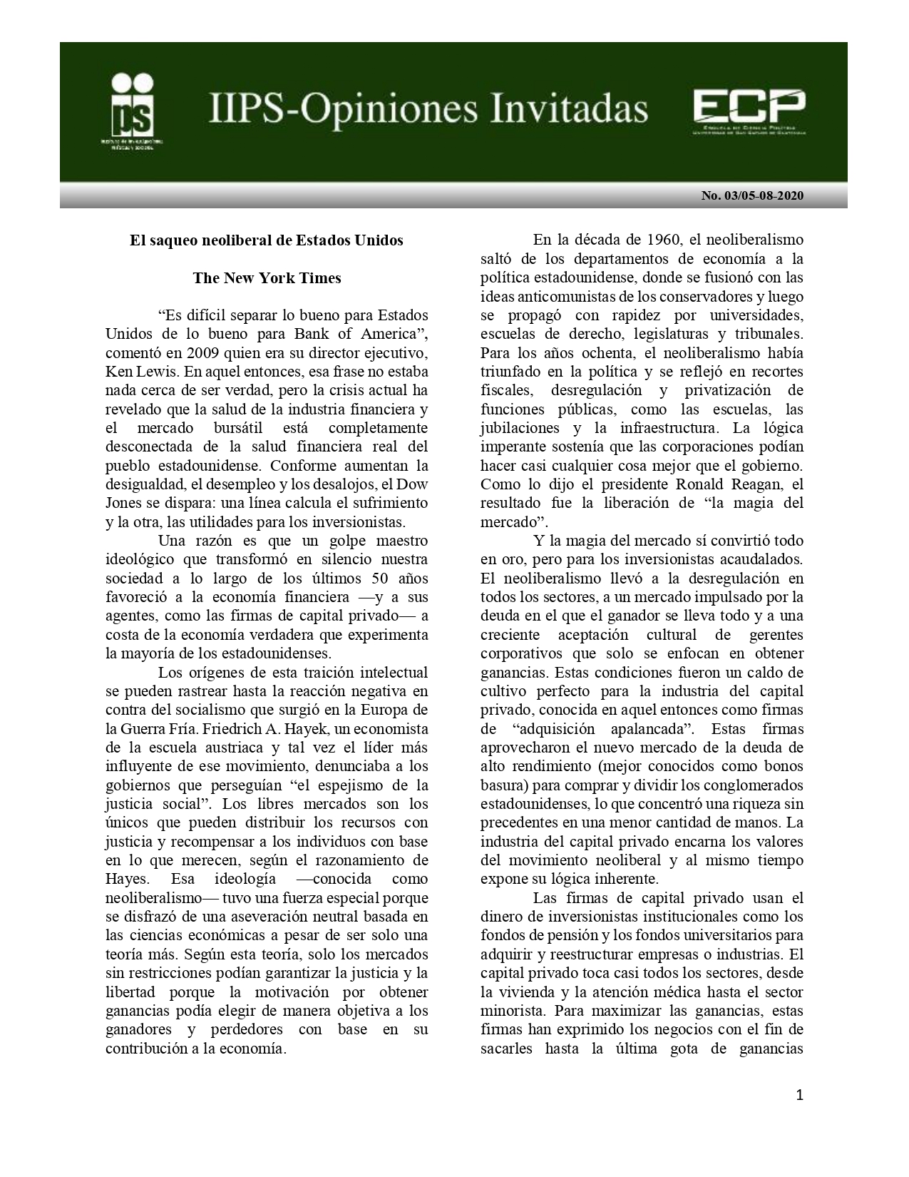 2020 Opiniones Invitadas The New York Times IIPS-Opiniones Invitadas No. 03-2020: “El saqueo neoliberal de Estados Unidos” por Administrador IIPS|Publicada 5 agosto, 2020
