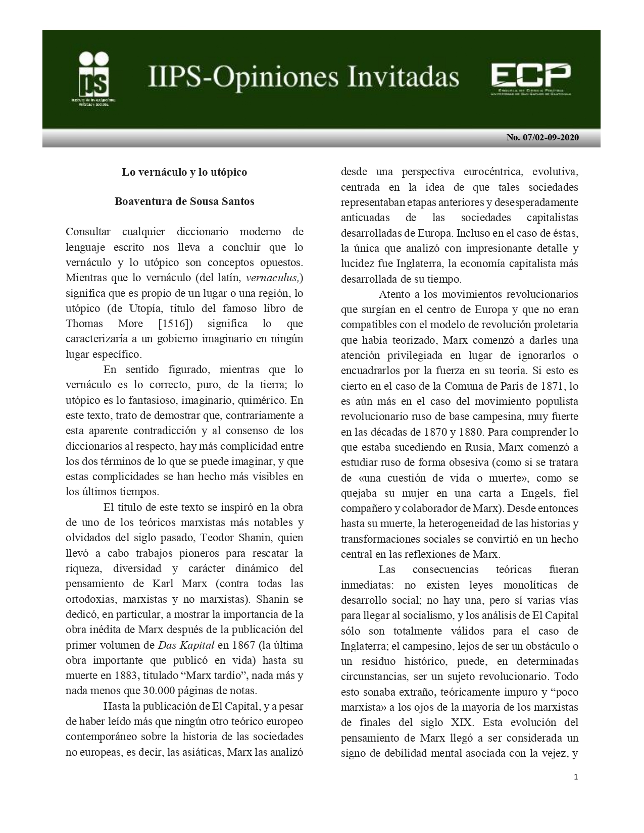 2020 Boaventura de Sousa Santos Opiniones Invitadas IIPS-Opiniones Invitadas No. 07-2020: “Lo vernáculo y lo utópico” por Administrador IIPS|Publicada 2 septiembre, 2020