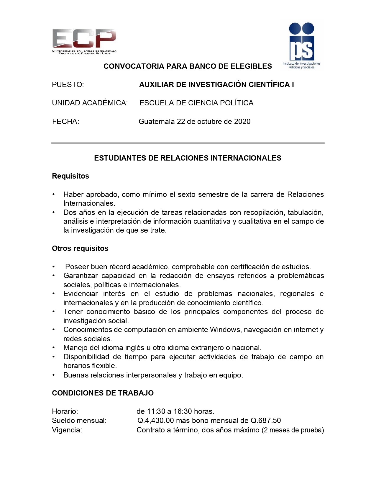 Sin categoría CONVOCATORIA PARA BANCO DE ELEGIBLES, AUXILIAR DE INVESTIGACIÓN CIENTIFICA I -RRII- por Administrador IIPS|Publicada 23 octubre, 2020