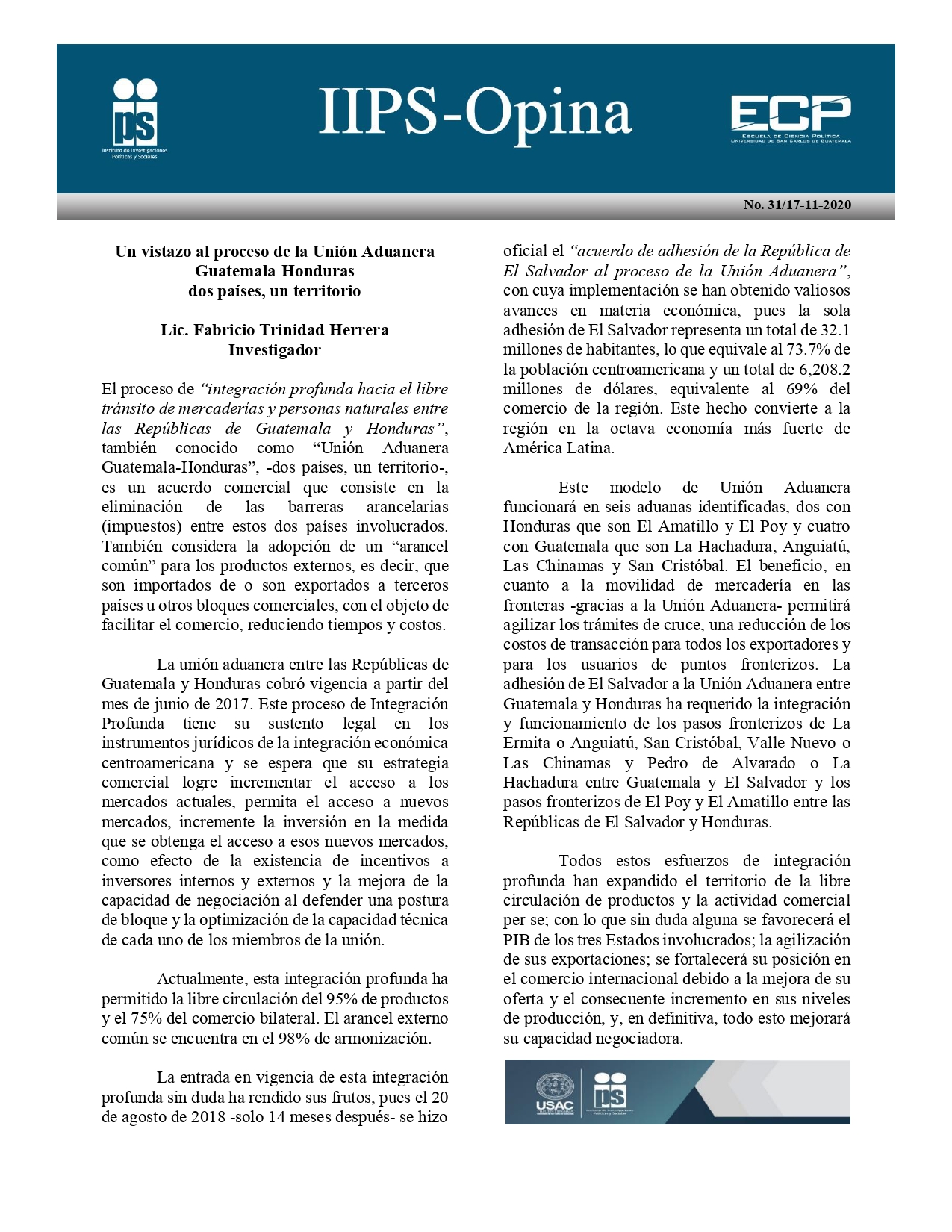 Sin categoría IIPS Opina No. 31-2020 “Un vistazo al proceso de la Unión Aduanera Guatemala-Honduras -dos países, un territorio-“ por Administrador IIPS|Publicada 17 noviembre, 2020
