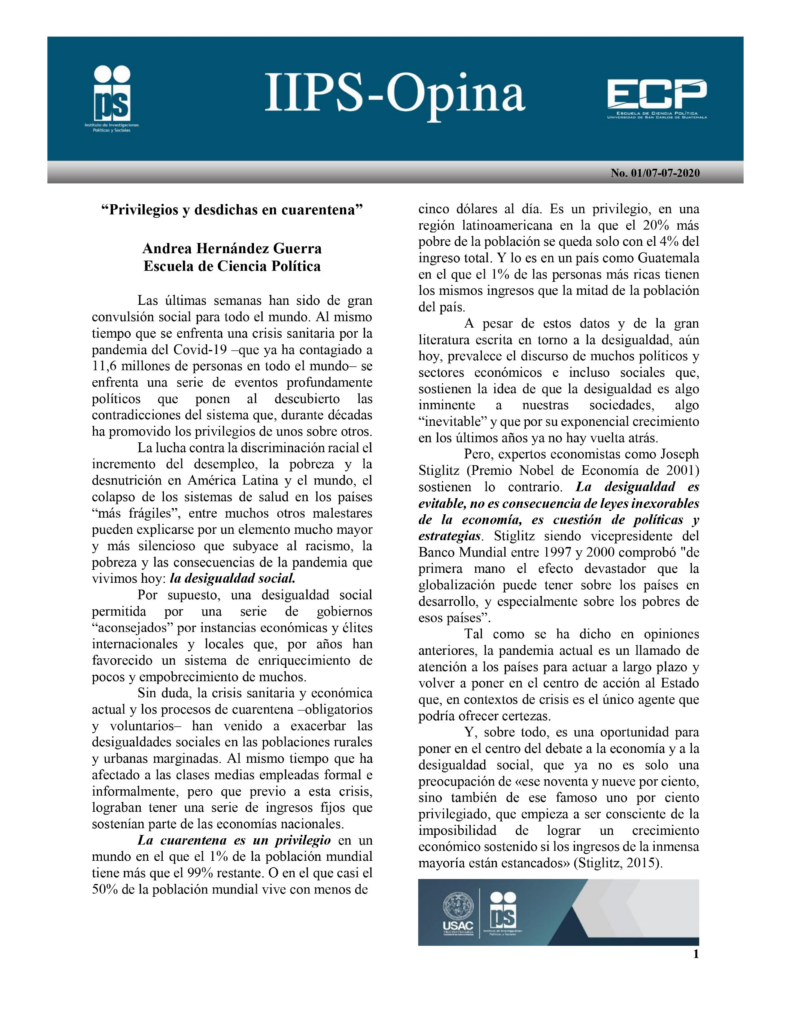 2020 Andrea Hernández Guerra IIPS Opina Sin categoría IIPS Opina No. 01-2020: “Privilegios y desdichas en cuarentena” por Administrador IIPS|Publicada 7 julio, 2020